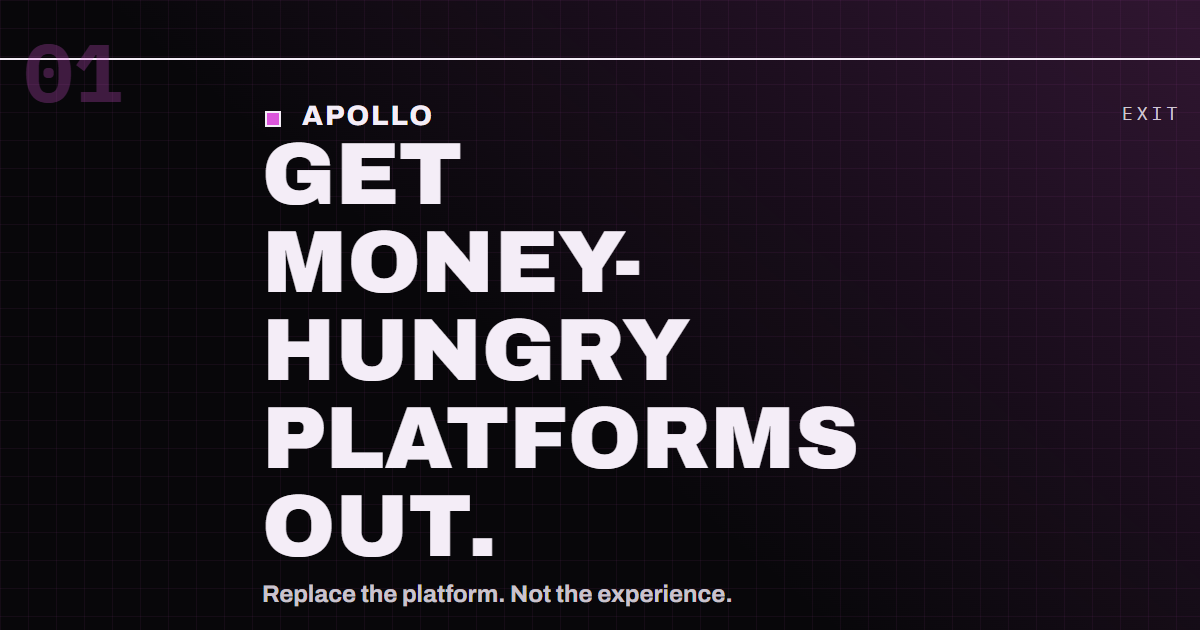 Apollo splits infrastructure, listening, and extension so leaving a closed service does not mean accepting a worse product. Keep what matters. Drop the business model behind it.
